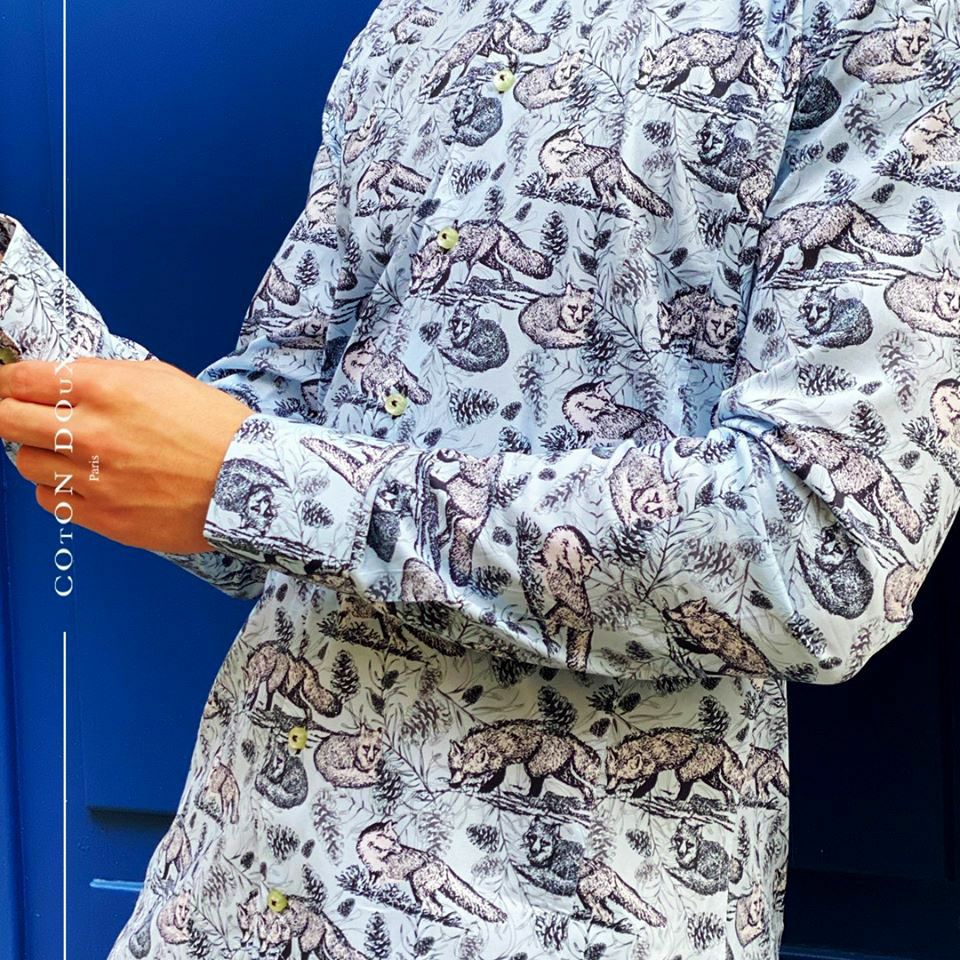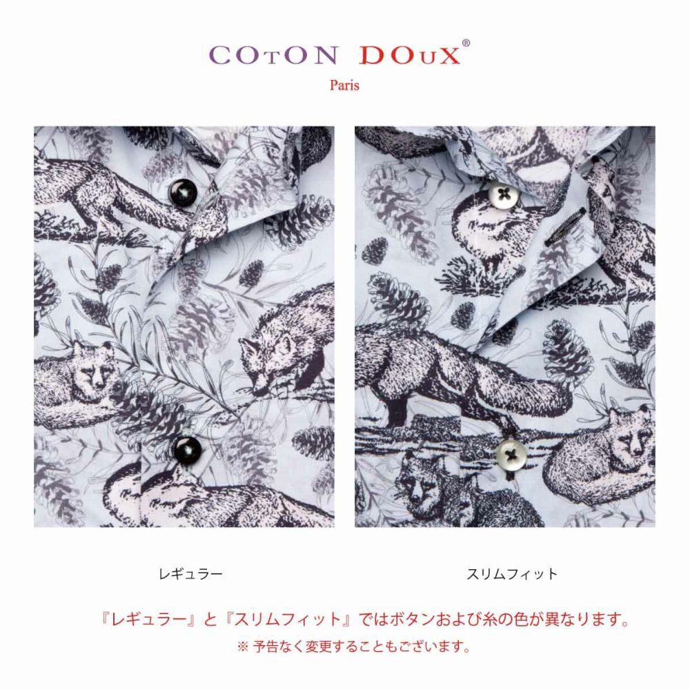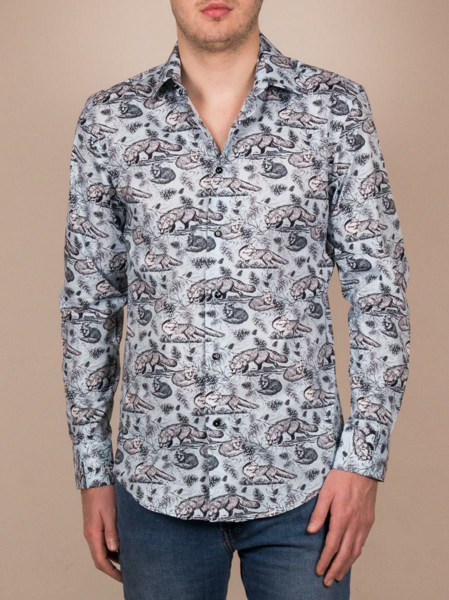 ビンテージのアロハシャツのようなカラートーンを抑えたかわいいキツネ柄のシャツ。アニマル柄を取り入れ、おしゃれに幅を持たせてセンスアップ。