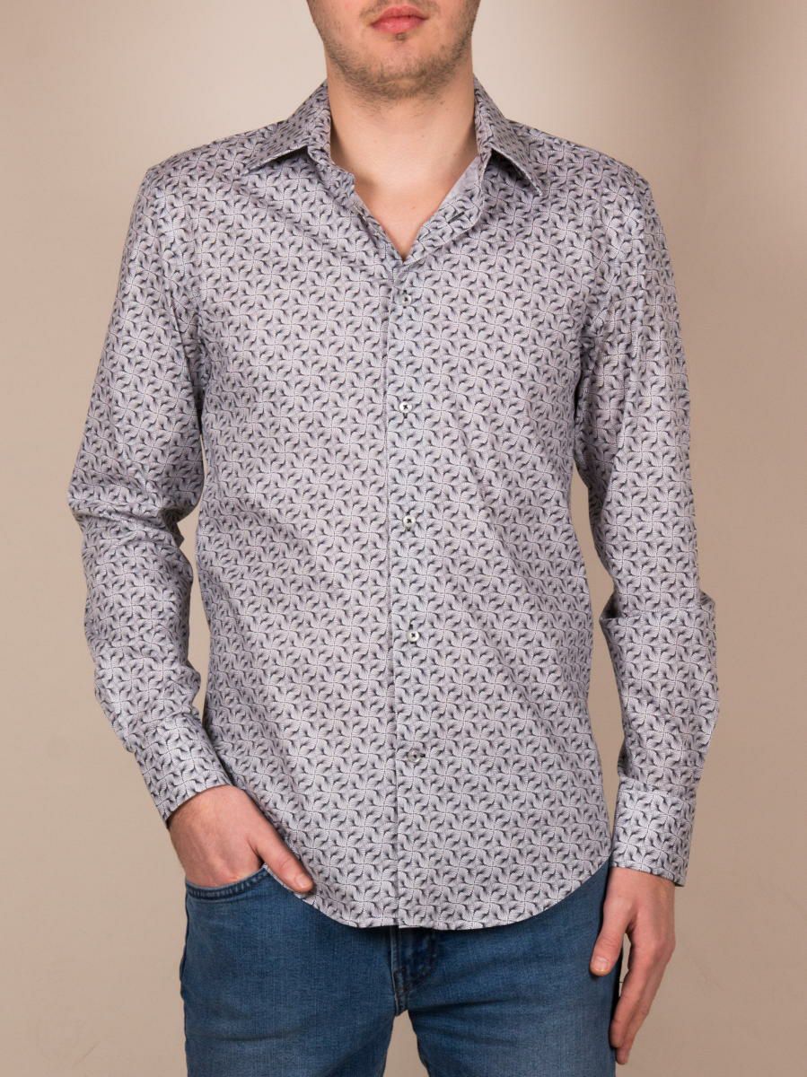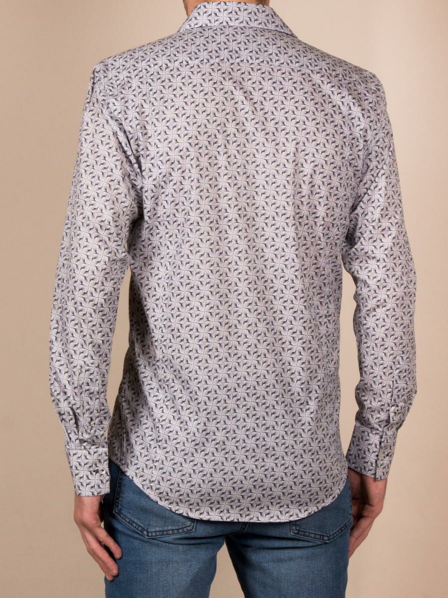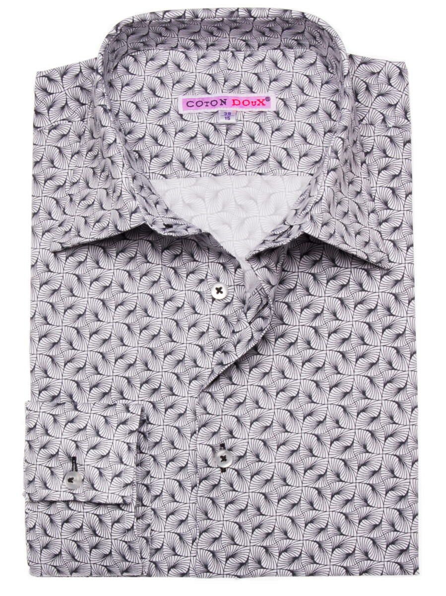 グレーとブラックの落ち着いたモノトーン配色のシャツ。シンプルなグラフィックデザインで、スーツに合わせても派手過ぎずクールです。