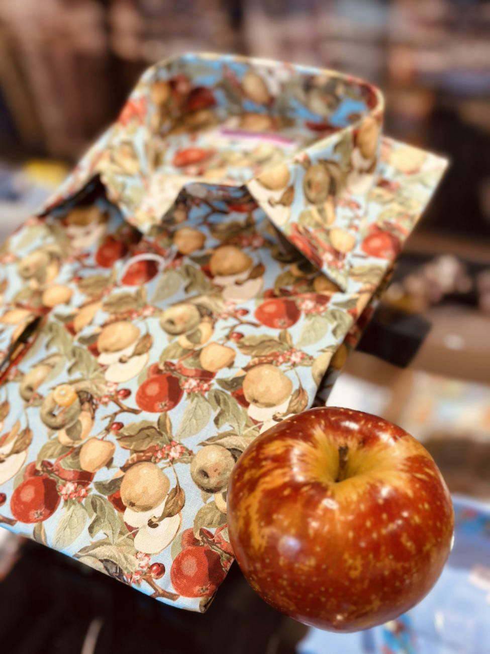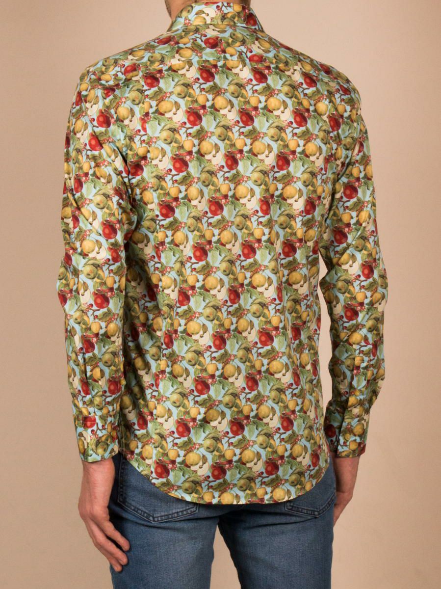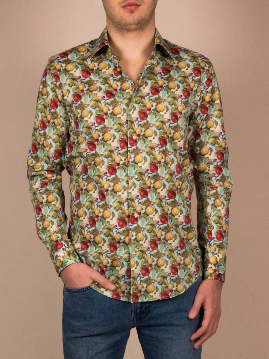 落ち着いた配色のモスグリーンに赤のリンゴ柄が映えるメンズシャツ。かわいいフルーツ柄がおしゃれのアクセントになります。