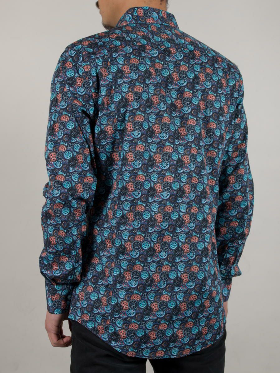 実際に手に取って見ると、明るくて良い感じで、気に入ってます 赤茶色のタイヤの絵が、全体のブルーの色合いを引き立て、 オシャレな雰囲気です センスの良いシャツを、いつも有難う御座います