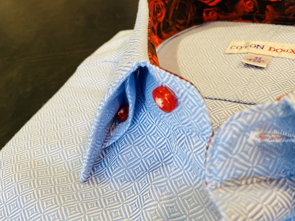 もうひとつ、シャツのフロント部分(前立て)のお話をさせてください。前ボタンに沿って二重にあわせた生地を施している前立てと、表に生地を当てないスッキリとシンプルな(のっぺり!?)仕様の前立てがあります。前者はトラッド系のシャツに多くいわゆるボタンダウンのシャツに多い仕様です。コトンドゥシャツの前立ては後者でして、フランスやイタリアでは主流のフレンチフロントという前立て仕様です。ドレッシーなシャツに多い仕様です。すっきりとスタイリッシュな前立てはコトンドゥの個性的なデザインがよく映えます。