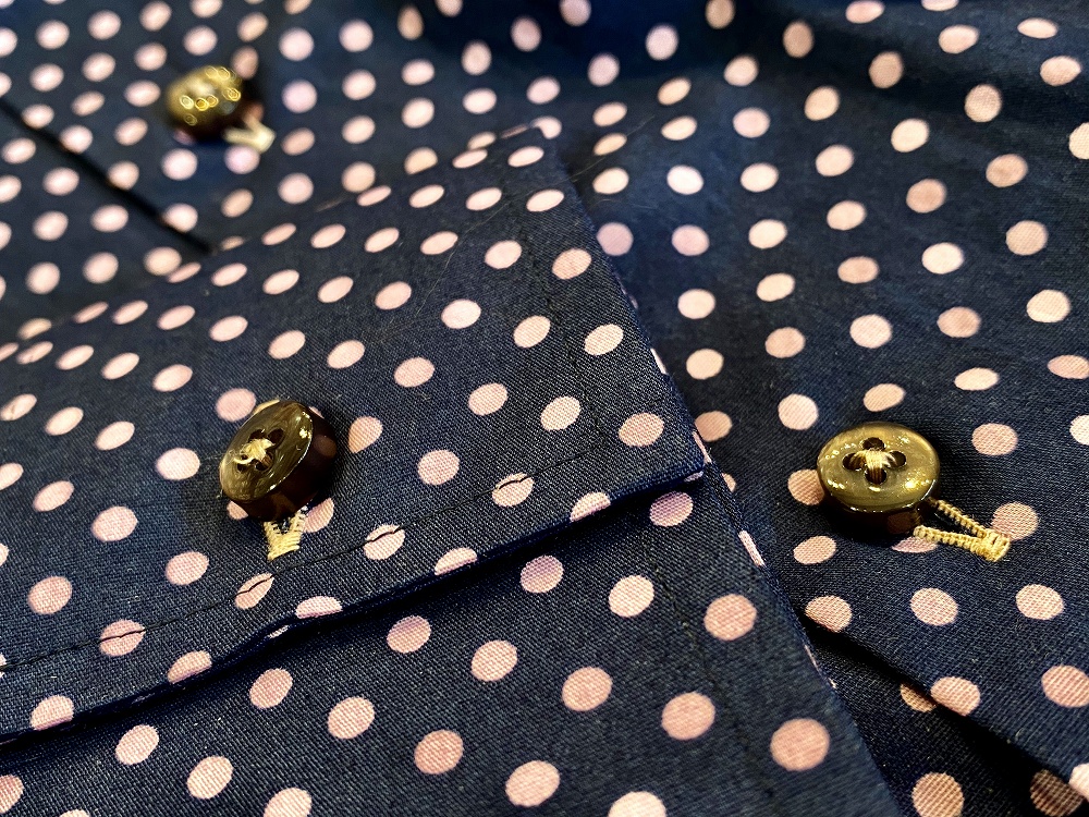 違いはしっかりとした襟(えり)と袖(そで)です。巷では、特に柄シャツでは、襟袖が柔らいものが多いのですが、私たちのシャツは襟と袖が違います。コシをもたせてキチッと綺麗に仕上げているこの襟袖にぜひ注目してみてください。言われないとなかなか気づかない細部のお話ですが、端々に良いもの着けると(端々が綺麗だと)全体的に綺麗に見える・・・っていう、ファッションのあの法則です。