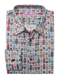 遊び心が一糸乱れず整列しています。全体的には上品な色味と柄、よーく見るとアメ車の大群。 「これ、なに?」「え、クルマなん」という会話だけで楽しいシチュエーションを作ってくれるシャツです。