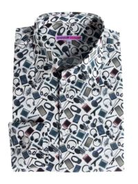 遊び心が一糸乱れず整列しています。全体的には上品な色味と柄、よーく見るとアメ車の大群。 「これ、なに?」「え、クルマなん」という会話だけで楽しいシチュエーションを作ってくれるシャツです。 -